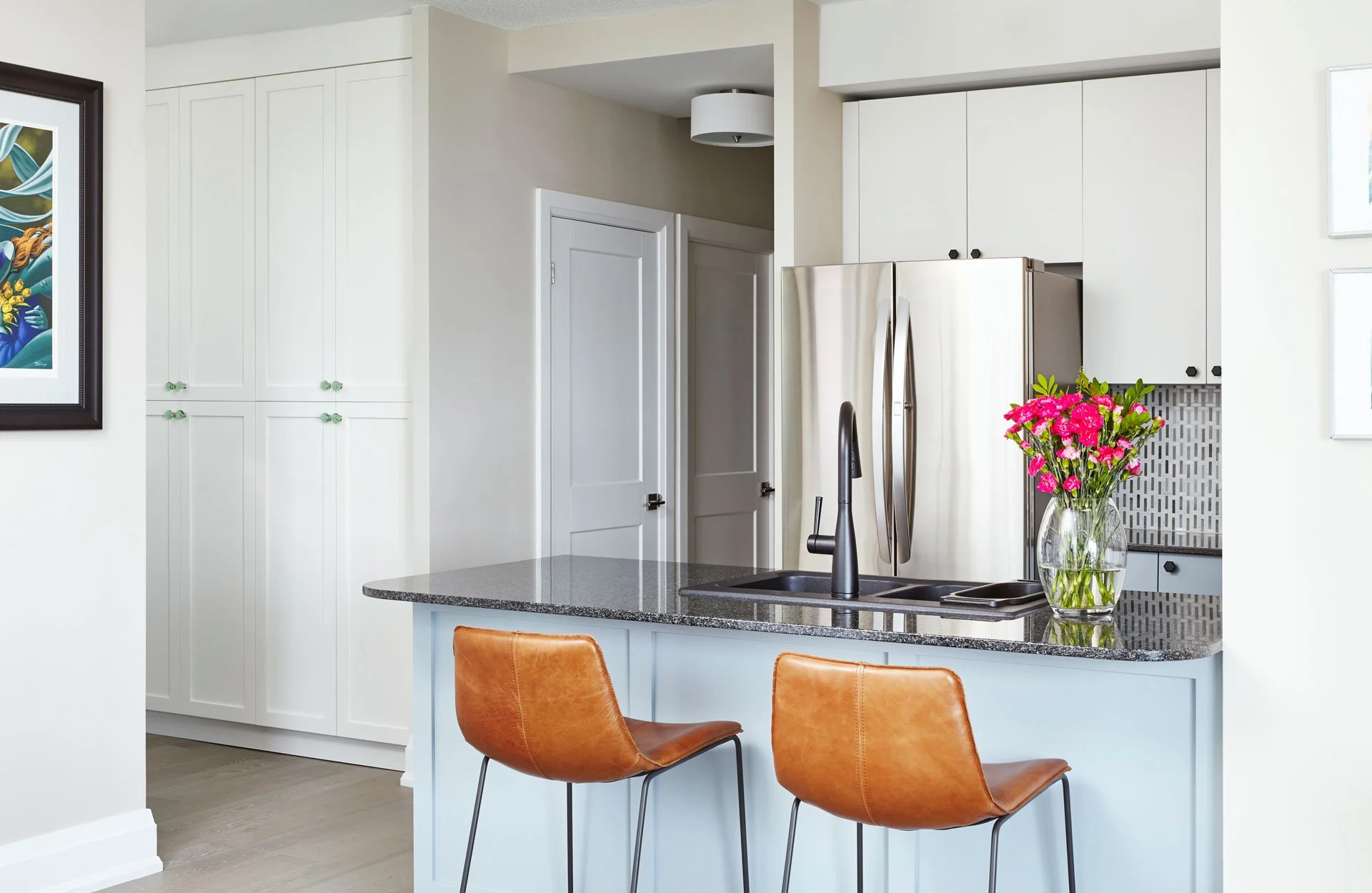 This client was downsizing from a detached suburban home into a two + one bedroom condo in the heart of downtown Toronto. Formerly an unkept rental, the space was completely gutted and reimagined to feel bright, colourful, and calming. Inspired by the clients’ love of travel, particularly their time in Hawaii, we drew from ocean tones and natural hues, layering soft greens, blues, greys, and sandy taupes throughout. Custom millwork played a key role, with thoughtfully designed cabinetry and furniture pieces that provide ample storage for their belongings from their previous home, with room to grow.
